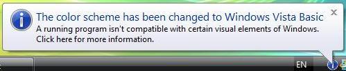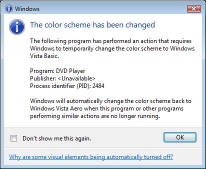 2. Preview DVD under Windows Vista: a message shown as "Message 1" will popup, click the message to further popup dialog box shown as "Message 2", click "OK", your color scheme will be temporarily changed to Windows Vista Basic when previewing DVD, and Windows will auto resume the original color scheme after you stop previewing DVD.