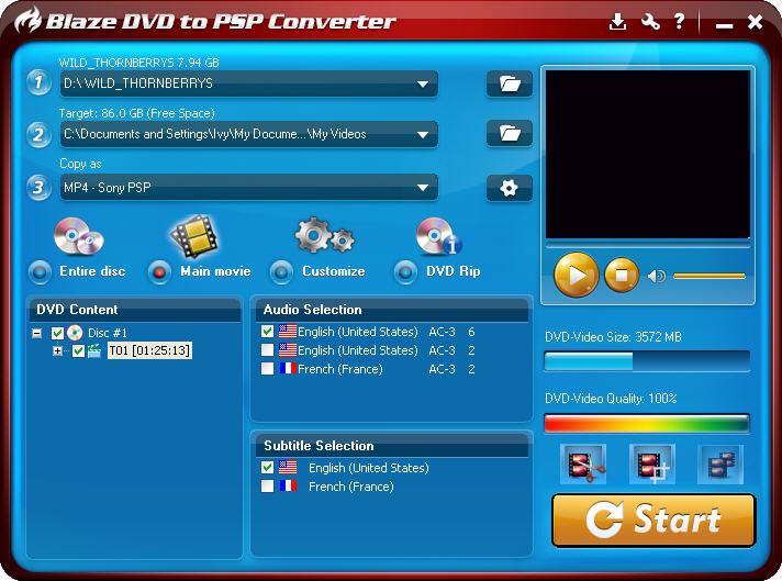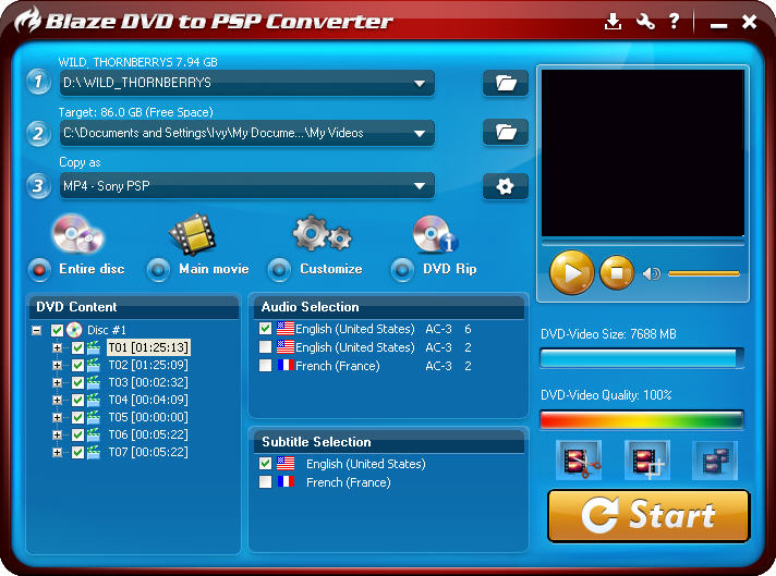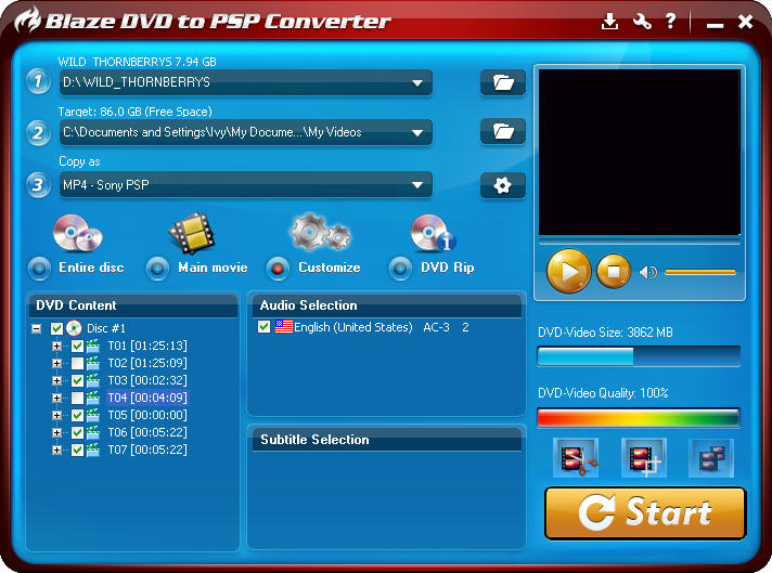 This guide mainly introduces how to use Entire disc, Main movie and Customize on BlazeVideo DVD to PSP Converter.