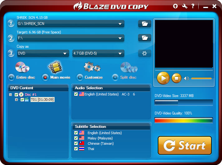BlazeVideo DVD Copy will intelligently recognize and select main movie title only to copy. With built-in compress engine, BlazeVideo DVD Copy will automatically compress and fit main movie into one blank DVD disc, if target disc size is less than main movie.