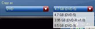Three options available: 4.7GB (DVD-5), 3.95 GB (DVD-R v1.0), 8.5 GB (DVD-9).