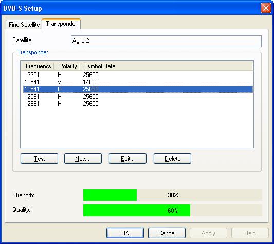 - New: add transponder. click "New" button, type Frequency, Symbol Rate, Polarity and FEC. All of these parameters can be accessed in the relative website.