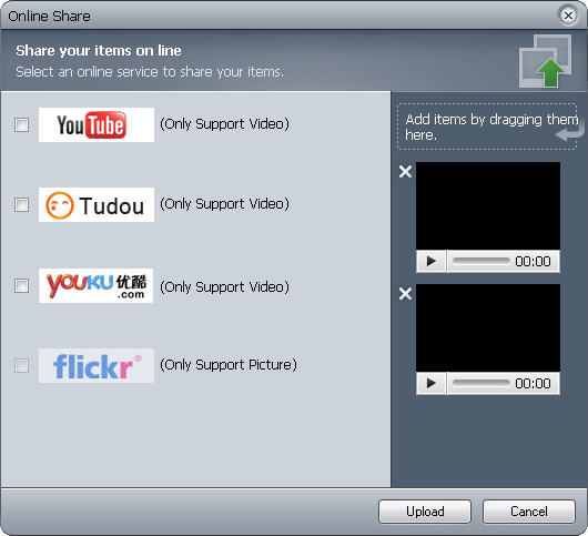 VideoFlick supports to upload your desired video or photo items to YouTube, Tudou,YouKU and Flickr to share them online with your friends or family.